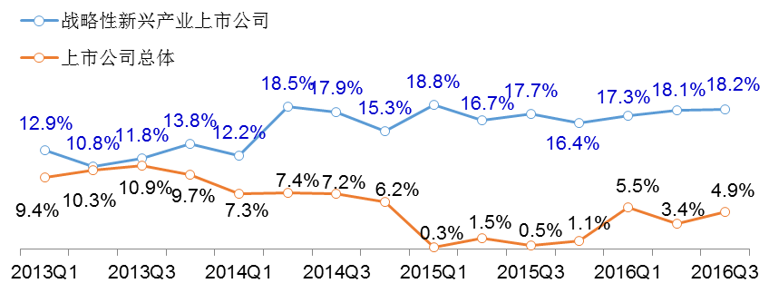 一、战略性新兴产业2016年发展情况 (一)战略性新兴产业总体发展态势良好 2016年战略性新兴产业27个主要行业主营业务收入达到19.1万亿元,同比增长11.3%,新兴产业一批新动能加快蓄积。具体来看,太阳能发电产业增长41.2%,锂电子电池制造业增长31.6%,信息化学品制造业增长17.8%,软件和信息技术服务业增长14.9%。 从上市公司角度分析,战略性新兴产业企业已成为资本市场的重要组成部分,是支撑我国上市公司总体业绩稳定增长的重要力量。2016年三季度,战略性新兴产业上市公司营收总额达21317.8亿元,同比增长18.2%(见图1),高于上市公司整体13.3个百分点,较去年同期提升0.5个百分点;实现利润总额2264.4亿元,增速高达29.7%,同期上市公司整体盈利继续下滑,战略性新兴产业良好的利润收益为其后续持续发展提供了保障。上半年,战略性新兴产业持续涌现一批营收增速超过20%且利润增速超过15%的高增长企业,这些引领战略性新兴产业上市公司整体增长的“排头兵”企业多集中在生物医药、智慧、信息安全等领域。
