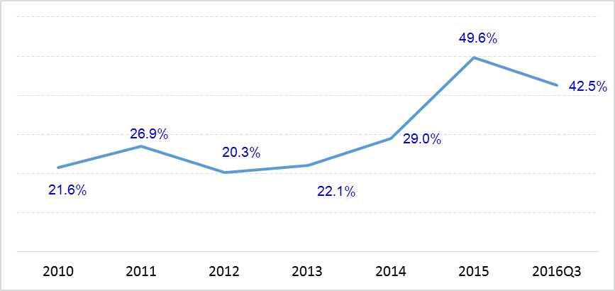 数字文化产业是以文化创意内容为核心,依托数字技术进行创作、生产、传播和服务的新兴产业,具备传输便捷、绿色低碳、需求旺盛、互动融合等特点,当下正在成为引领新供给、新消费,规模高速成长的数字创意产业的重要组成部分。 一、产业当前发展的主要特点 (一)产业规模快速增长 近年来,在互联网信息技术快速迭代升级的推动下,在人民群众消费升级、对精神文化产品需求日益增加的拉动下,数字文化产业迎来了大发展。在经济下行压力增大的背景下逆势增长。从上市公司数据看,自2010年以来数字文化产业上市公司营收增速一直在20%以上(见图1)。2016年1-3季度数字文化上市公司营收达657.8亿元,增速为42.5%。2015年数字文化产业企业上市公司营收为668亿元,增速为49.6%,近两年的迅猛增长主要是由于2014、2015年有多家数字文化产业企业或借壳上市,或调整业务方向,剥离传统产业,切入数字文化领域(据不完全统计,2014年以来共有9家企业借壳,6家企业调整业务)。充分显示出数字文化产业近年来发展的火热程度。