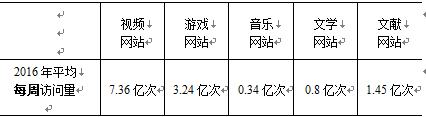 从细分领域行业数据来看,根据《2016年中国游戏产业报告》,2016年,中国游戏市场销售收入达到1655.7亿元,同比增长17.7%,我国游戏用户规模已达到5.66亿人。动漫领域,2015年总产值已经达到1131 亿元,“十二五”期间复合增长率近20%,2016年预计将突破1300亿元。我国泛二次元用户规模超过1亿人。网络视听领域,2015年产业营收规模达531.5亿元,比2014年增长36.8%。2016年上半年网络音乐市场营收25.4亿元,规模相当于2015年全年总营收的74.1%;2016年是直播元年,2016年上半年网络直播市场营收82.6亿元,2015-2016 年 10 月,全国在线直播平台数量超过 200 家;网络剧、网络电影为代表的网络原创视听节目创作生产高速增长,网络视频市场需求日益旺盛(如表1)。截至2016年上半年,我国网络视频用户规模达5.14亿,占网民总数的70%以上。网络文学领域是IP源头,2015年整体市场规模接近70亿元,预计国内网络文学市场规模2016年将高达90亿元。根据中国互联网络信息中心2016年初发布的《第37次中国互联网用户发展状况统计报告》显示,截至2015年年底,网络文学用户规模已经达到2.97亿,占网民总体的43.1%。 表1 网络文化细分领域2016年每周平均访问量